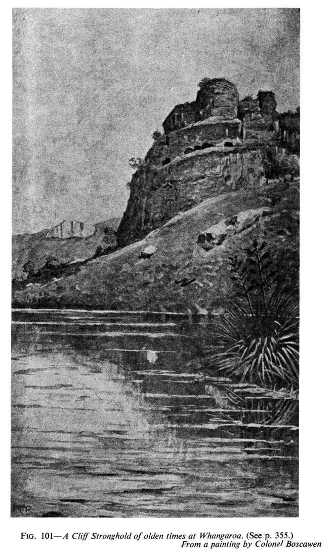 The cliff stronghold referred to in the above painting by Colonel Boscawen is most likely Okahumoko in Pekapeka Bay. From the New Zealand Gazette, published in 1927.