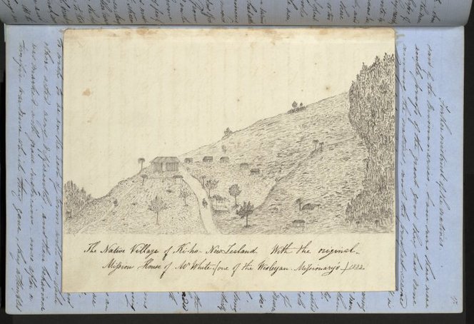 Thomas Laslett - 'The native village of Ki-ho, New Zealand, with the original Mission House of W White (-?) of the Wesleyan Missionary, 1823'. 1833 Pen & ink on paper, in a notebook or diary, 180 x 230mm.