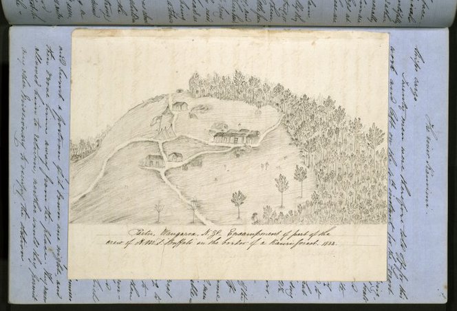 Thomas Laslett - 'Paetu, Wangaroa, NZ. Encampment of part of the crew of HMS Buffalo on the border of a Kauri forest, 1833'. Pen & ink on paper, in a notebook or diary, 180 x 230 mm.