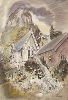 Eric Lee-Johnson 'Whangaroa'. 1950. Ink & watercolour, 580 x 390 mm.