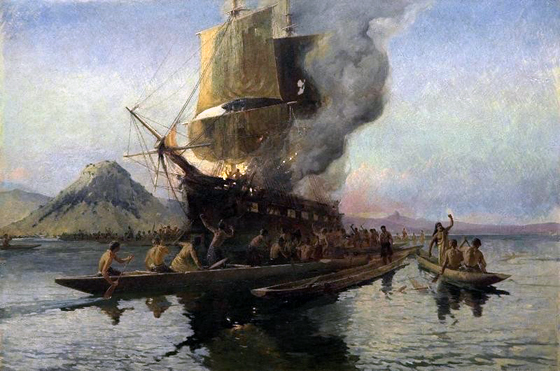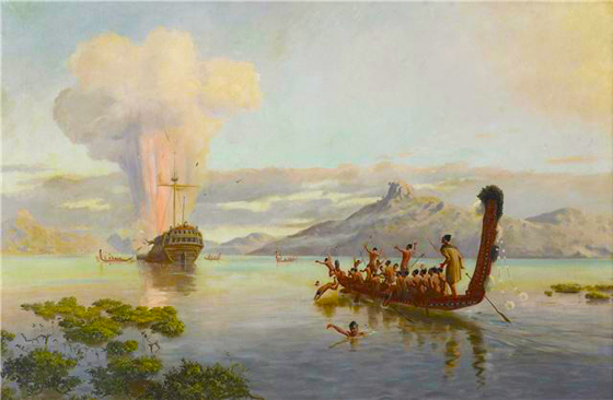 'The Burning of The Boyd, Whangaroa Harbour 1809' by Walter Wright, 1908. Courtesy of Auckland City Art Gallery.