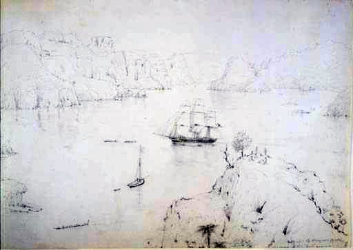 Charles Heaphy - 'Entrance of Wangaroa, North - The scene of the Boyd Massacre'. 1840. Pen & ink drawing, 28 x 40 cm. Courtesy of Auckland War Memorial Museum.
