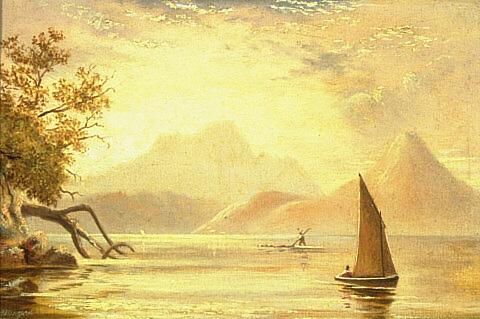 Charles Blomfield - 'Whangaroa, showing Taratara and figures in a canoe'. 1879. Oil on canvas, 437 x 681 mm.
